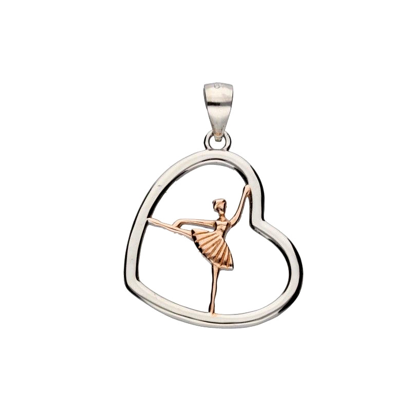 MEDÁL, 925-ÖS RÓDIUMMAL BEVONT EZÜST, RÓZSASZÍN ARANYOZOTT EZÜSTTEL, FEHÉR CIRKÓNOKKAL, BALETT-TÁNCOSSAL, SZÍVVEL KOMBINÁLVA, MÉRETEK 19mm X 21mm.