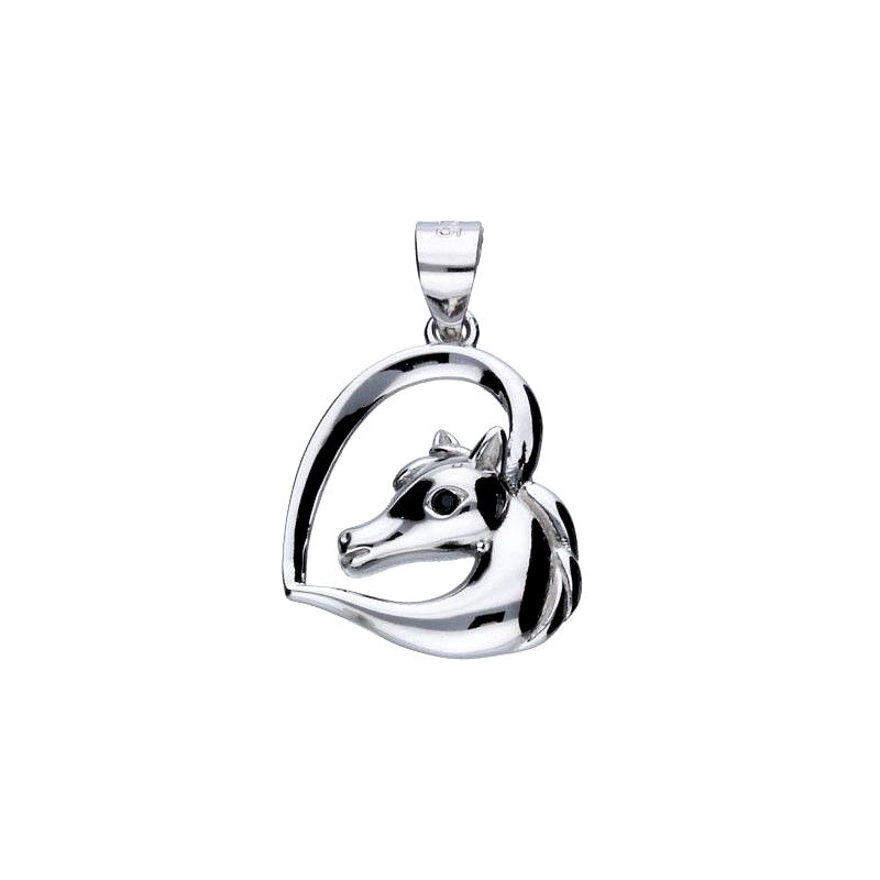 Medál, szív lómellszoborral, ródiummal bevont 925-ös ezüst, fekete cirkónium, medál méretei akasztó nélkül 15mm X 17mm.